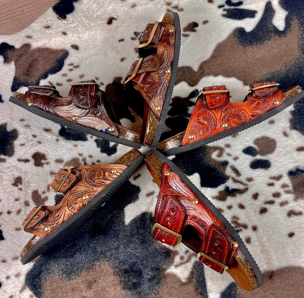 Custom hand made, hand tooled, hand painted leather double strap sandals. All women’s size 6US models