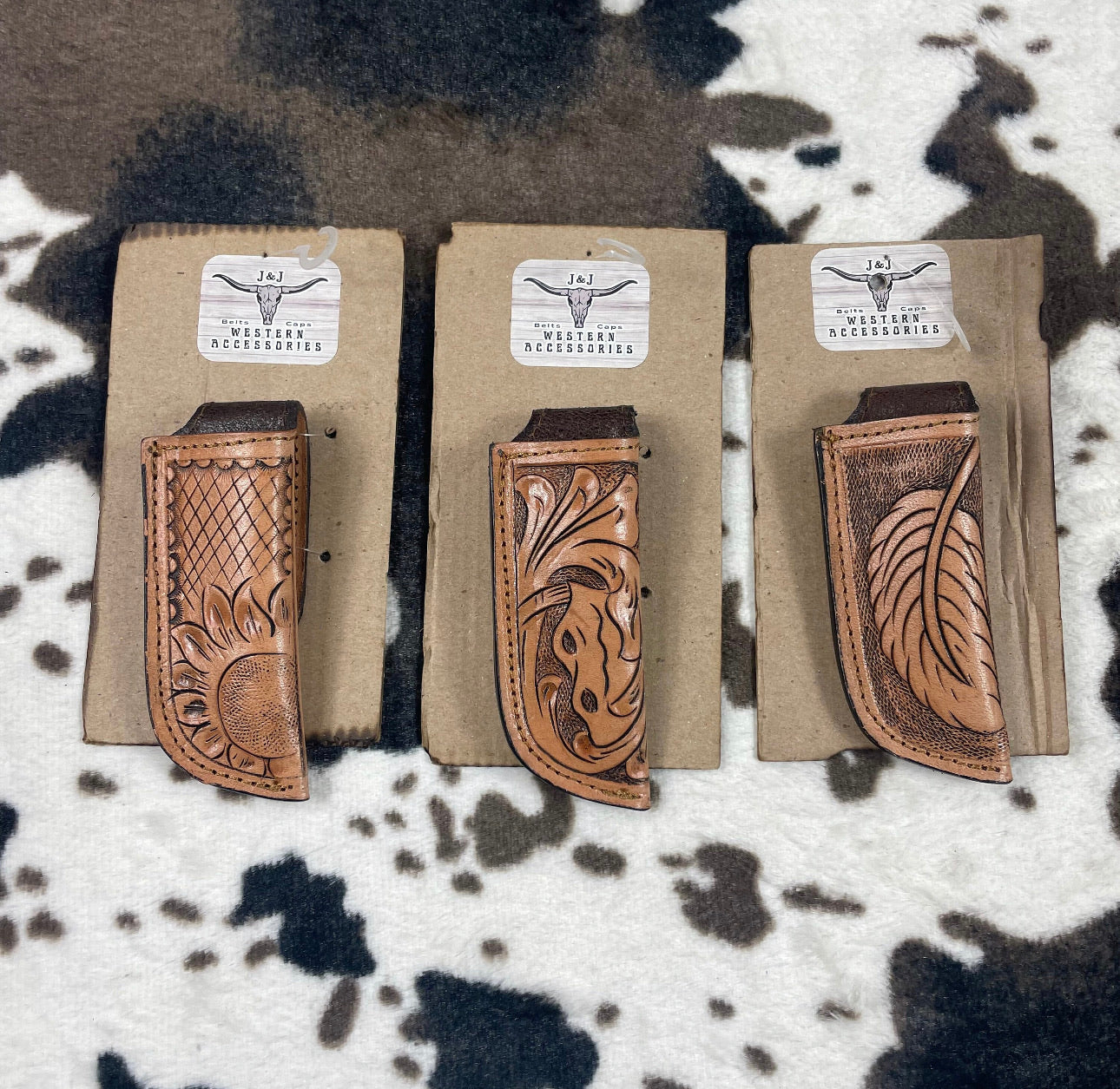 Beautiful handmade high quality leather knife holsters. Made in variety of pattern. Belt loop at the back. Comes in a 2 inch width and a 1 inch width to choose between. Also available in different color of leather.